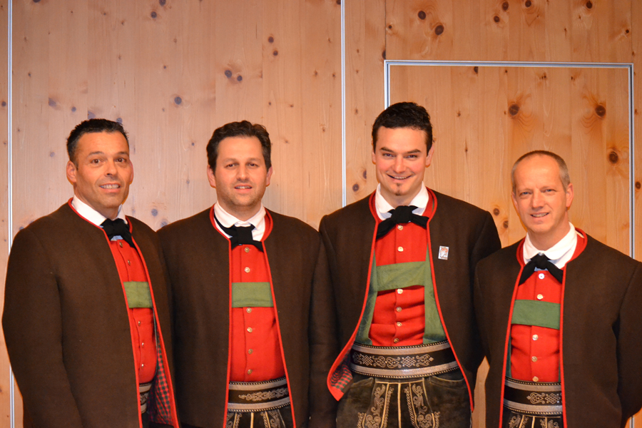 Im Bild v. l. n. r.: Der bisherige Obmann Josef Hilpold, Obmann Markus Stockner, Vizeobmann Hannes Mitterrutzner, Kapellmeister Eduard Gamper