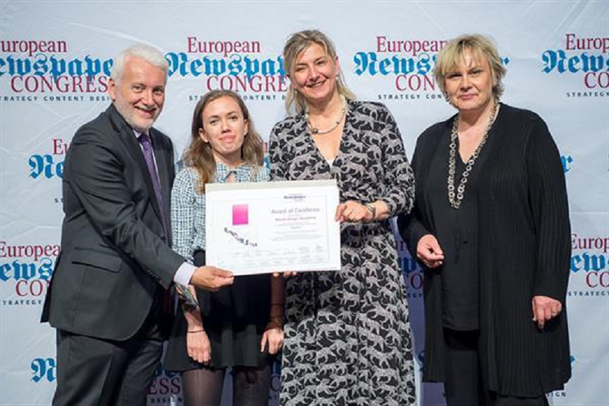 Dozentin Katharina Reitan und die verantwortliche Studentin Sophie Winder nahmen die Urkunde in Empfang. Die Werbe Design Akademie Innsbruck konnte den „European Newspaper Award“ nunmehr in den vergangenen Jahren sechs Mal in Folge gewinnen.