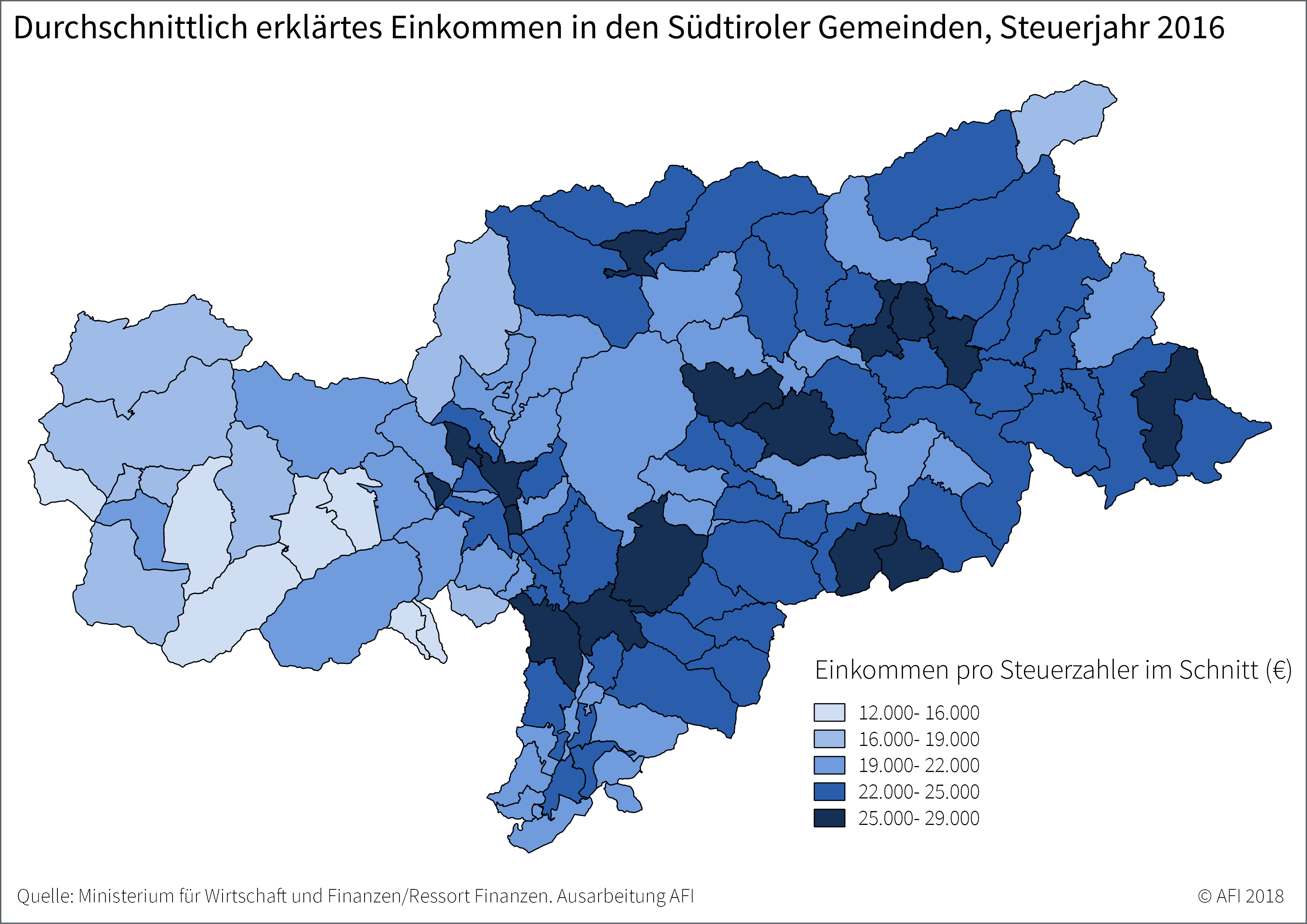 Mit Blick auf das im Schnitt gemeldete Einkommen weisen Südtirols Gemeinden erhebliche Unterschiede auf. „Dahinter verbergen sich lokal unterschiedliche soziodemografische, strukturelle und wirtschaftspolitische Gegebenheiten, zu denen sich auch noch die Steuerhinterziehung gesellt”, so Perini. Die fünf Gemeinden mit dem höchsten durchschnittlichen Einkommen pro Steuerzahler sind Corvara in Badia (28.022 €), Bruneck (27.892 €), Pfalzen (27.642 €), Kiens (27.233 €) und Eppan (26.128 €). Die Landeshauptstadt Bozen fällt im Vergleich zum Vorjahr vom siebten auf den neunten Rang zurück (26.055 €). Am unteren Ende der Rangliste kommt der Westen ins Spiel. Schlusslichter sind die Vinschger Gemeinden Latsch (14.807 €), Taufers i. M. (14.432 €), Martell (13.920 €), Kastelbell-Tschars (13.308 €) und Laas (12.787 €).