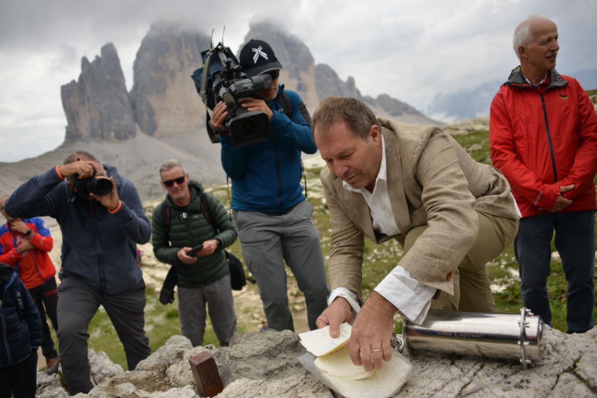 Anschließend ging es zur Dreizinnenhütte, von wo man den besten Blick auf das weltbekannte Dreigestirn in den Dolomiten hat. Nach einer kurzen, inmitten der Sextner Bergwelt aber sehr bewegenden Andacht, wurde die Zeitkapsel 21.08.2019 – 21.08.2069 gesegnet. Darin befinden sich die Wünsche, Träume und Hoffnungen, welche die Kinder der Grundschulen von Toblach und Sexten zu den Drei Zinnen – Dolomiten verfasst haben. Sie werden bis zur Wiedereröffnung in 50 Jahren im Rahmen des Jubiläums 2069 darin aufbewahrt. Einige Gäste der Feier ließen es sich nicht nehmen, ebenfalls ihre guten Wünsche schriftlich festzuhalten und in dem nachhaltigen und eigentlich sehr unauffälligen Kunstwerk für kommende Generationen aufzubewahren.