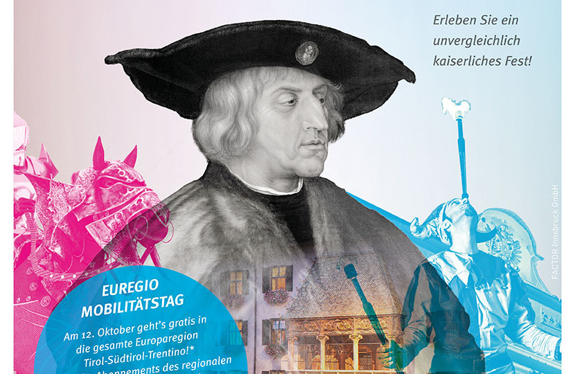 Ein Tag im Zeichen von Kaiser Maximilian I. und der Euregio – die Anreise nach Innsbruck lässt sich im Rahmen des Euregio-Mobilitätstages stau- und stressfrei sowie umweltschonend gestalten: Am 12. Oktober können alle Inhaber eines EuregioFamilyPasses sowie eines VVT-Jahres-, Senioren oder Semester-Tickets den öffentlichen Personennahverkehr in der gesamten Europaregion kostenlos nutzen. Ausgenommen sind Fernverkehrszüge.