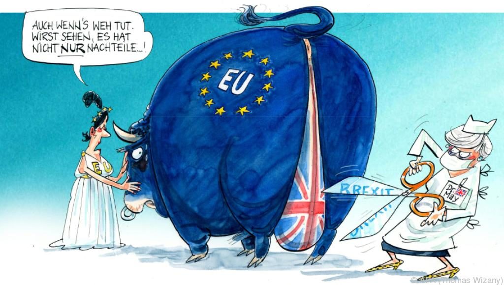 Da begegnet man etwa dem „vollen Boot“ von Luis Murschetz aus dem Jahr 1989 ebenso wie dem Deix’schen „EU-König Mock“. Bei Heinz Ortner ziehen „alle an einem Strang“ (nur leider im Kreis), und bei Thomas Wizany wird der Brexit zur Ochsenkastration.