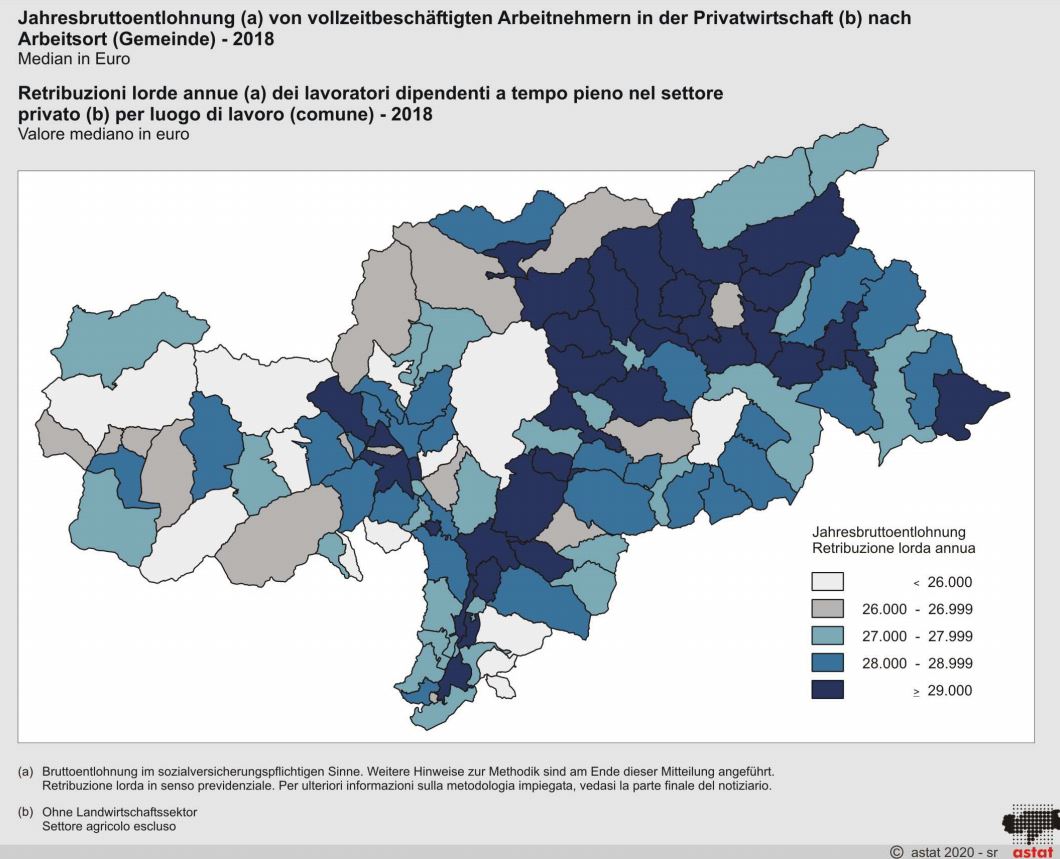 Die mediane Jahresbruttoentlohnung eines vollzeitbeschäftigten Arbeitnehmers in Südtirol beläuft sich im Jahr 2018 auf 29.223 Euro. Deutlich höher – nämlich bei 30.759 Euro – liegt dieser Wert, wenn man nur die Arbeitnehmer mit Arbeitsort in Bozen oder im Wipptal (31.537 Euro) betrachtet. Auch bei Betrachtung der Verteilung der Gehälter nach Wohnort der Arbeitnehmer liegt Bozen (29.034 Euro) in der Mitte, wobei in diesem Fall der höchste Wert im Wipptal (30.565 Euro) verzeichnet wird. Auffallend ist, dass die mediane Entlohnung im Wipptal und in Bozen bei den dort Ansässigen deutlich niedriger ist als bei den Arbeitnehmern im Allgemeinen. Dies legt laut ASTAT die Vermutung nahe, dass von den Einpendlern durchaus gut bezahlte Jobs besetzt werden.