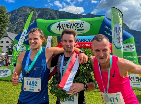 Freuen sich über ihren Erfolg beim 22. Achenseelauf: Sieger Manfred Senn (Mi.), Zweitplatzierter Marek Pavličko (re.) sowie Stefan Wagger am dritten Rang. - Foto: Achensee Tourismus