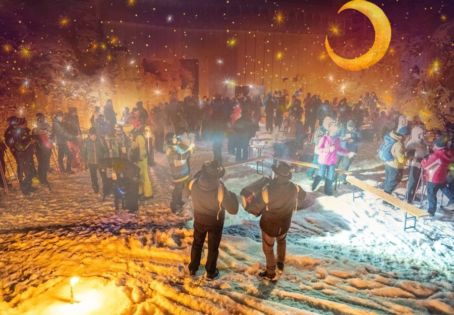 Si parte da Malga Millegrobbe nella terra degli ultimi cimbri rimasti, un sorso d’aperitivo e uno sguardo alla luna calante, e poi via con cellulari accesi e frontalini che illuminano la via. Si sale in silenzio verso le trincee dove si è toccati lievemente dalla brezza che, se l’ascolti bene, ti porta i patemi dei giovani soldati caduti quassù. Si prosegue la marcia nella “Tannebalt”: è un lungo serpentone, il fuoco acceso in punti sicuri indica la via. Le luci dentro il buio compongono figure effimere che vanno e vengono mentre il freddo della notte ti ricorda che esisti: questa è la “ciaspomagna cimbra”.