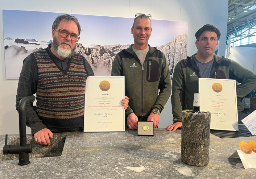 Heuer ging die Auszeichnung an insgesamt 21 Unternehmen – 13 im Bereich Gestaltung und acht im Bereich Technik. In der Kategorie Technik überzeugte auch das Südtiroler Unternehmen südtirol.stein GmbH aus Terlan, berichtet der lvh in einer Pressemitteilung. Die Firma verarbeitet Findlingsteine, welche bei Aushüben zutage treten, im Flussbett entdeckt werden oder auch bei Felsstürzen entfernt werden müssen. Diese werden vor Ort mittels einer transportablen Seilsäge abgebaut, veredelt und daraus besondere Projekte für Kunden gestaltet. Beeindruckt war die Jury von der Außenküche aus Passeier Gneis Granat, welche von südtirol.stein hergestellt wurde. Die beiden Gesellschafter Hans Karl Trojer, der auch Obmann der Berufsgemeinschaft der Steinmetze und Bildhauerim lvh ist, und Peter Watschinger nahmen den Preis dankbar entgegen. Sie betreiben selbst einen Steinbruch und verwenden Material von Steinbrüchen aus ganz Südtirol.