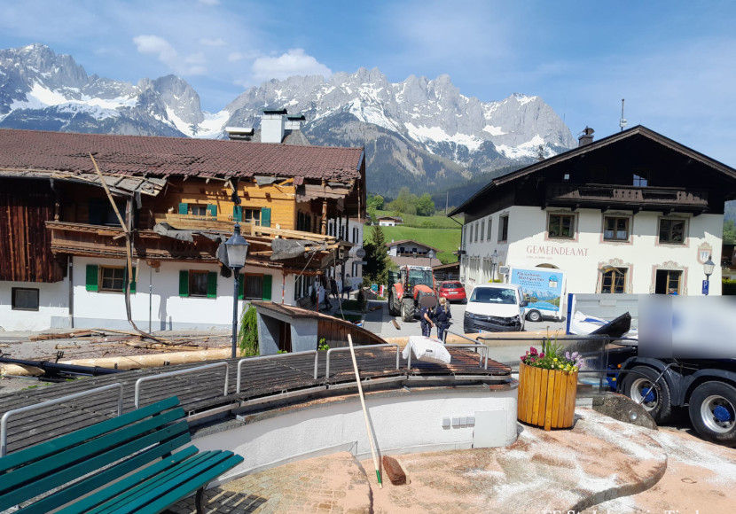 Ein siebenjähriger Junge (Österreicher) wurde vom herabfallenden Ausleger getroffen und erlitt dadurch schwere Verletzungen im Bereich des Fußes sowie Verletzungen unbestimmten Grades im Bereich des Gesichts. Er wurde vom Rettungshubschrauber in das Krankenhaus nach Innsbruck geflogen. Der herabfallende Baum traf ein nebenstehendes Gebäude, welches als Gasthof Wilder Kaiser in der Fernsehserie „Der Bergdoktor“ bekannt ist sowie ein Fahrzeug, welche dadurch erheblich beschädigt wurden. Der Dorfplatz wurde für die Dauer der Unfallaufnahme und Aufräumarbeiten gesperrt. Weitere Erhebungen zum Unfallhergang sind im Gange.