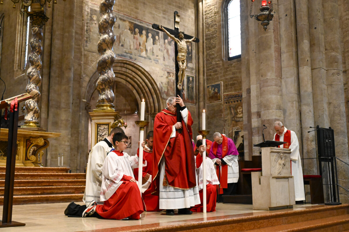 La contemplazione di Gesù che muore in croce è al centro della celebrazione del Venerdì Santo. In cattedrale a Trento, l’arcivescovo Lauro ha presieduto nel pomeriggio l’azione liturgica della Passione e Morte di Gesù, prostrandosi in silenzio davanti al crocifisso, prima dell’adorazione silenziosa da parte dei molti fedeli presenti in Duomo.