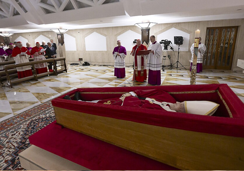 An diesem hatte Franziskus häufig die Frühmesse zelebriert. Der tote Papst trägt nach Angaben des Vatikans ein rotes Gewand und eine weiße Bischofsmitra. Um die gefalteten Hände ist ein Rosenkranz geschlungen. Rechts und links wacht ein Mitglied der Schweizer Garde. Am Mittwoch wird der Leichnam um 09.00 Uhr in den Petersdom überführt.