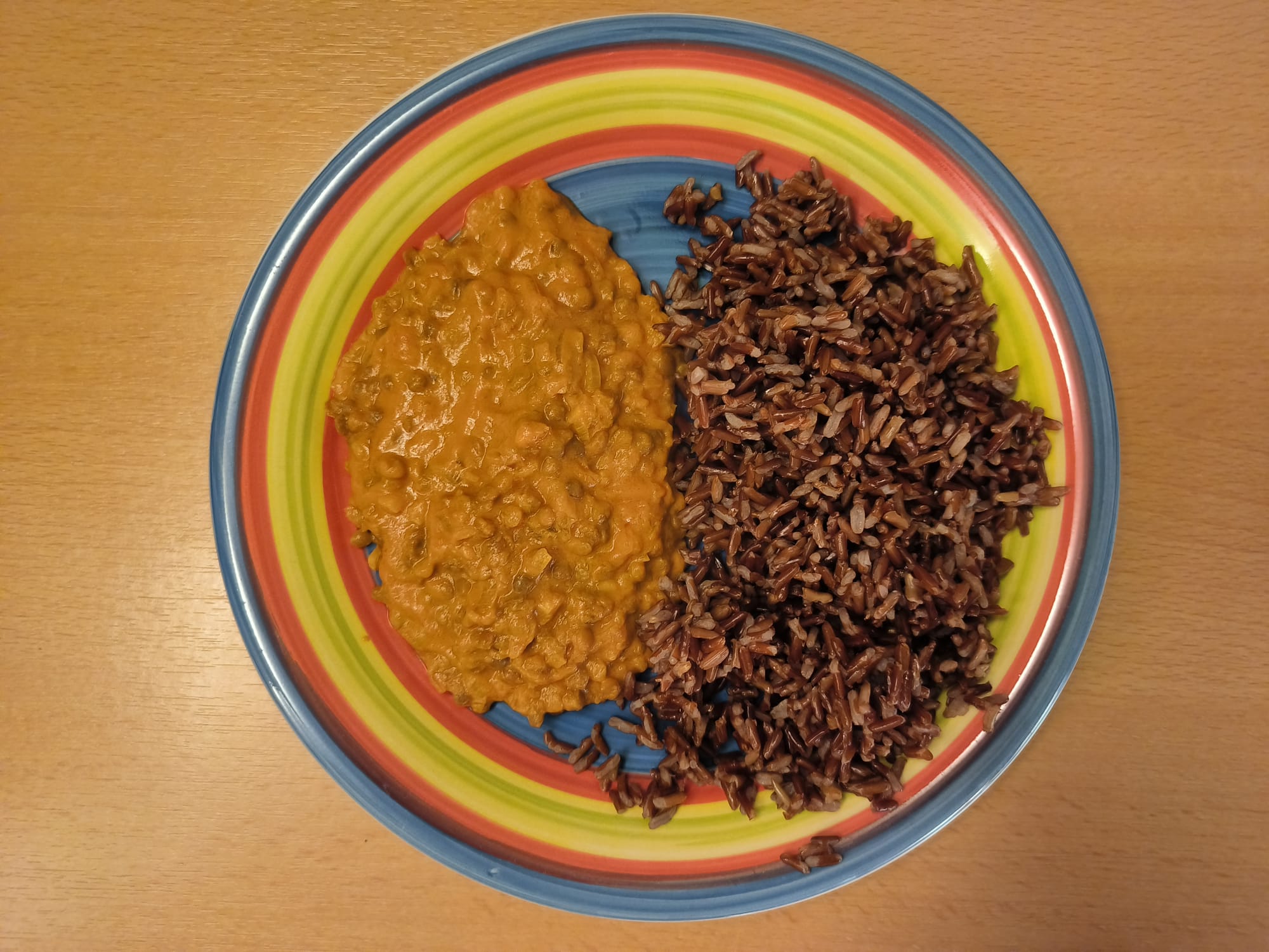 Una volta cotto, scolare il riso. Quando le lenticchie avranno raggiunto una consistenza cremosa, potete servire il dahl di lenticchie rosse accompagnato con riso.