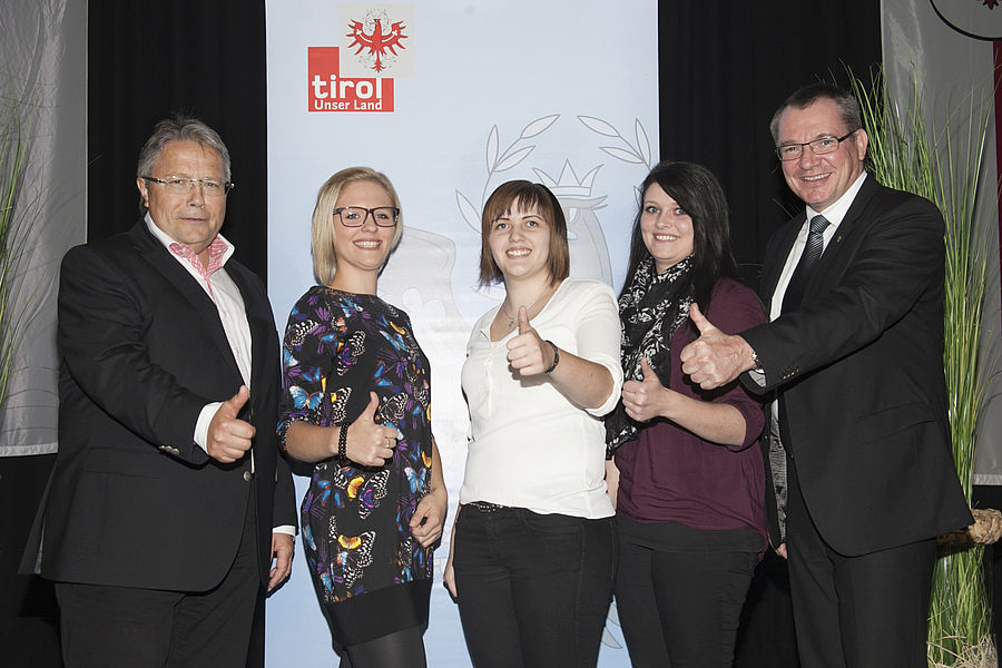 Johannes Tratter (re) und Franz Hörl, Bezirksstellenobmann der Wirtschaftskammer Schwaz mit den Lehrlingen, die die Höchstförderung erhielten: Lisa Gabriela Brunner aus Schlitters, Anna-Maria Wurzer aus Stans sowie Angelika Tonauer aus Achenkirch Foto: Land Tirol/Die Fotografen