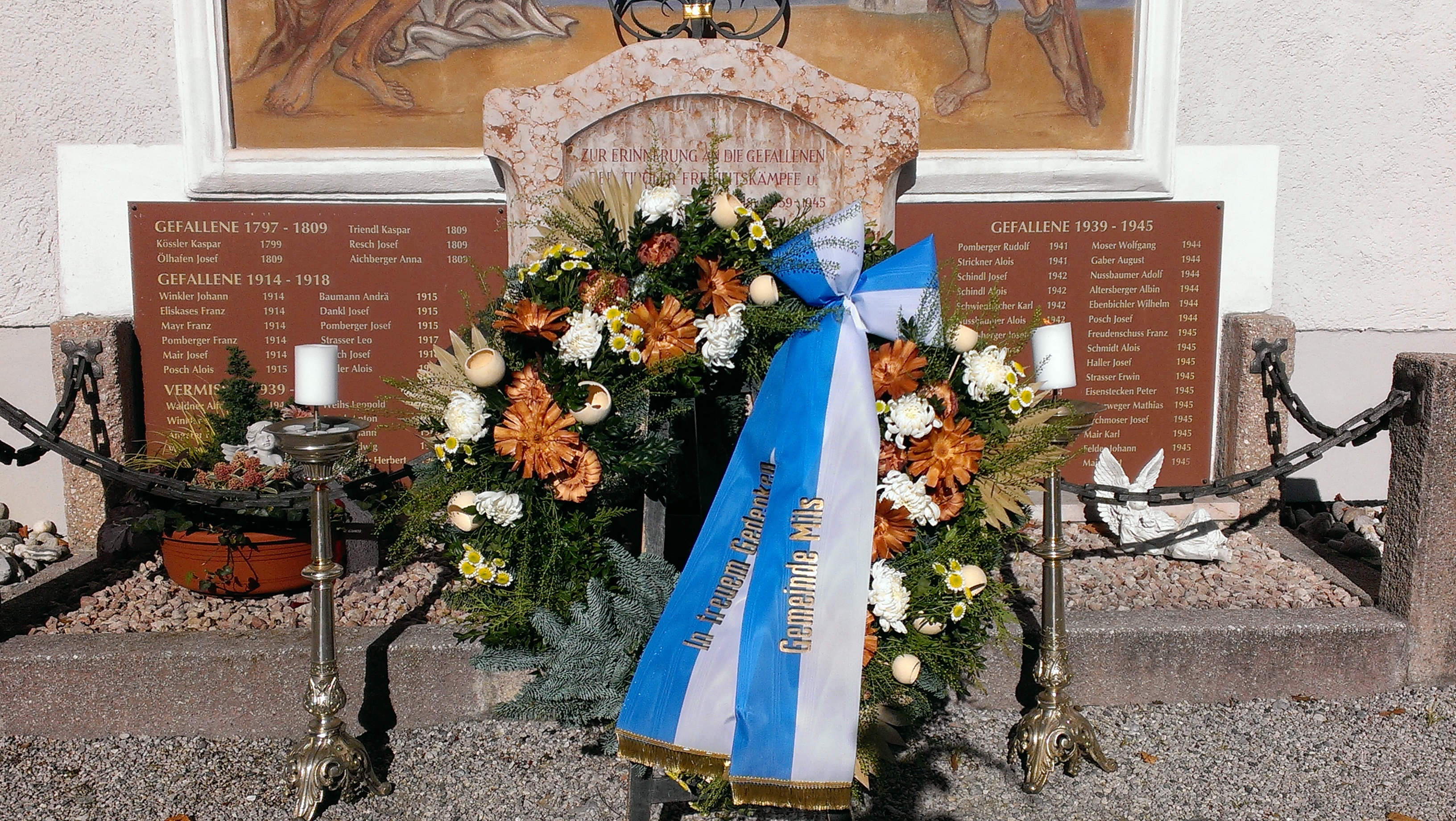Die Heilige Messe hielt Ortspfarrer Franz Angermayer. In seiner viel beachteten Rede lobte er die Tätigkeiten der Schützenkompanie Mils. Nach der Kranzniederlegung beim Kriegerdenkmal erfolgte die Ehrensalve durch die Schützenkompanie Mils. Bürgermeister Dr. Peter Hanser erinnerte in seiner Gedenkansprache auch an den Beginn des Ersten Weltkrieges vor 100 Jahren und zeigte auf, welch schreckliches Leid dieser Krieg über Europa und Tirol gebracht hat. Die Musikkapelle spielte das Lied vom Guten Kameraden.