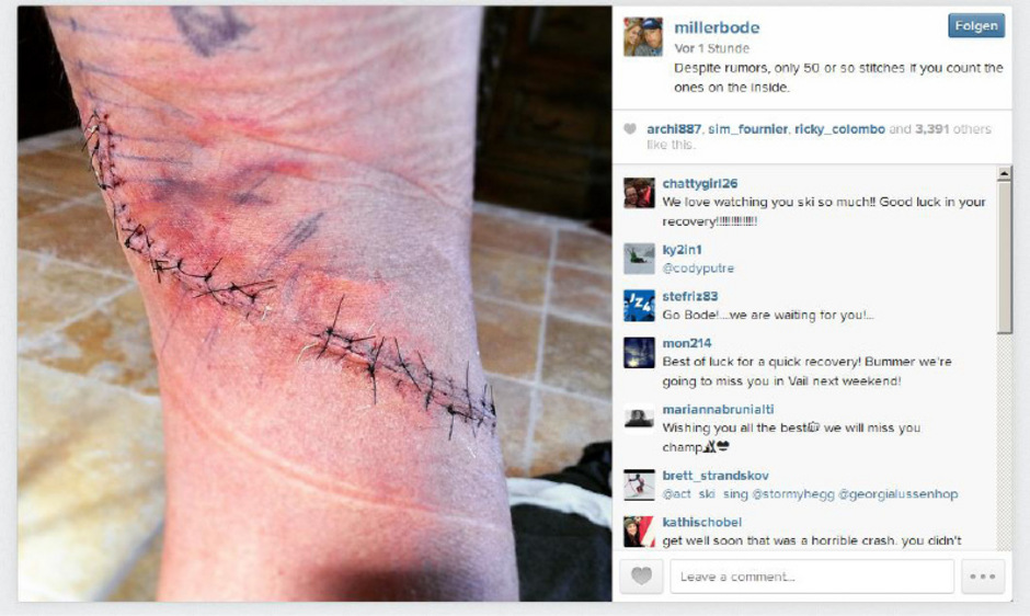 US-Skistar Bode Miller präsentierte auf Instagramm ein Foto seiner genähten Schnittwunde. Der US-Amerikaner zog sich die Verletzung bei einem Sturz während des Super-G in Vail / Beaver Creek zu.
