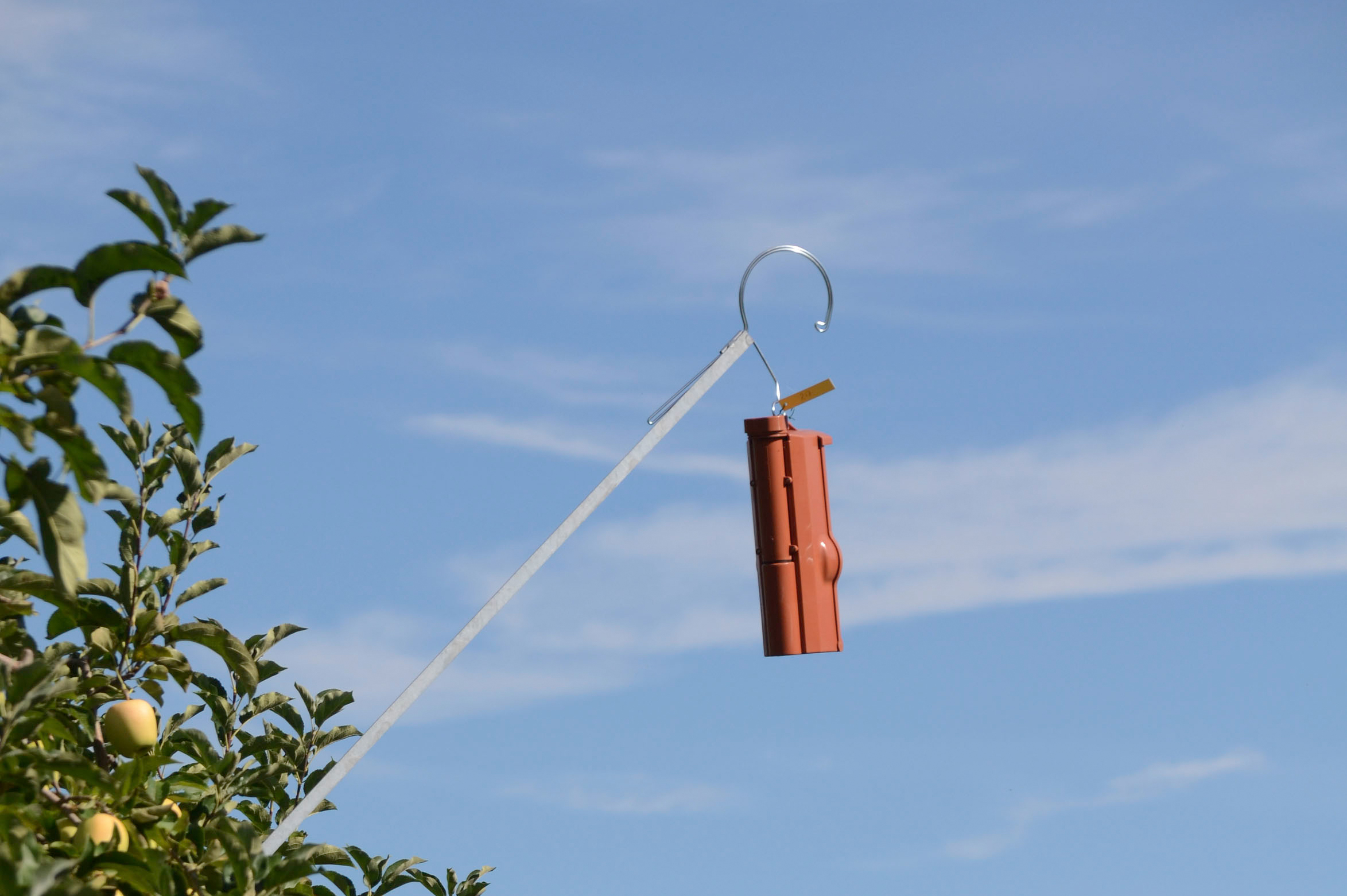 Die Verwirrungstechnik mit den sogenannten Aerosoldispensern wurde in den letzten Jahren auf mehreren Versuchsparzellen getestet. Nach guten Ergebnissen kommt diese Technik heuer bereits auf etwa 4.000 ha zum Einsatz. Bei den Aerosoldispensern werden nicht Ampullen, sondern kleine Behälter mit Duftstoffen, in der Apfelanlage verteilt. Diese sind mit einem Timer versehen und geben in periodischen Abständen in den Abend- und Nachtstunden Duftstoffe ab. Wesentlich für den Erfolg ist nämlich eine gleichmäßige und kontinuierliche Abgabe des Duftstoffes.