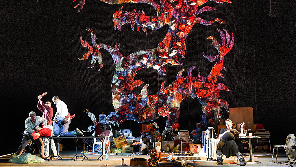 „Der goldene Drache“ wurde als Koproduktion der Oper Frankfurt und dem Ensemble Modern im Juni vergangenen Jahres uraufgeführt und in derselben Konstellation in Bregenz umgesetzt. Der ungarische Komponist Peter Eötvös schuf auf Basis von Roland Schimmelpfennigs gleichnamigem Theaterstück ein Stück verdichtetes Musiktheater, das von einer Szene zur nächsten rennt, dazwischen immer wieder kurze (Denk-)Pausen macht, inne hält, weiterläuft, sich ständig in neuem Licht darstellt.