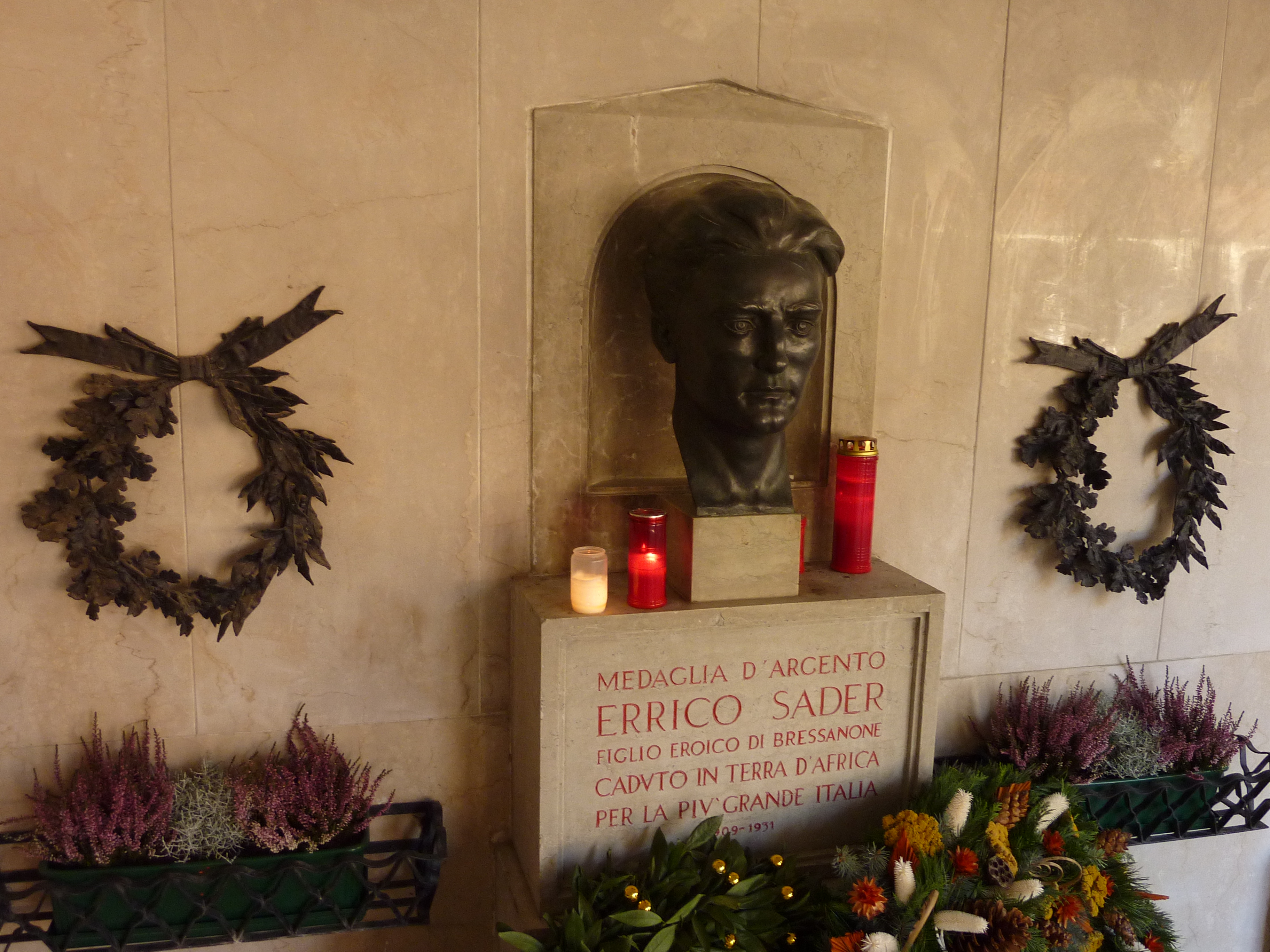 „Caduto in terra d’Africa per la più grande Italia“ (Gefallen in Afrika für das größere Italien“), steht dort unter der Büste des Brixners Heinrich Sader (umgetauft in Errico), der im Jahr 1931 in Libyen unter nie geklärten Umständen ums Leben gekommen ist. Die Inschrift besagt also, dass Sader für die italienische Großmannssucht in Afrika gefallen sei. Italien hat 1911 der Türkei den Krieg erklärt, um sich die türkischen Provinzen Cyrenaika und Tripolitanien mit Fezzan, das heutige Libyen, sowie die Inselgruppe des Dodekanes einzuverleiben.