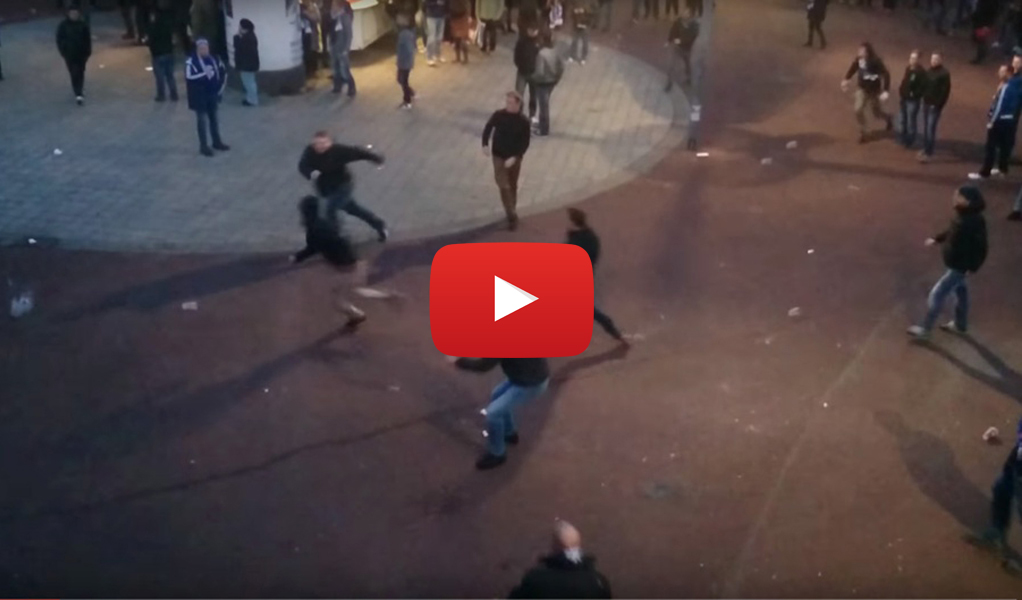 Die Polizei probierte die Situation zu schlichten, denn die Anhängern der Knappen ließen sich provozieren, wie das Video zeigt: