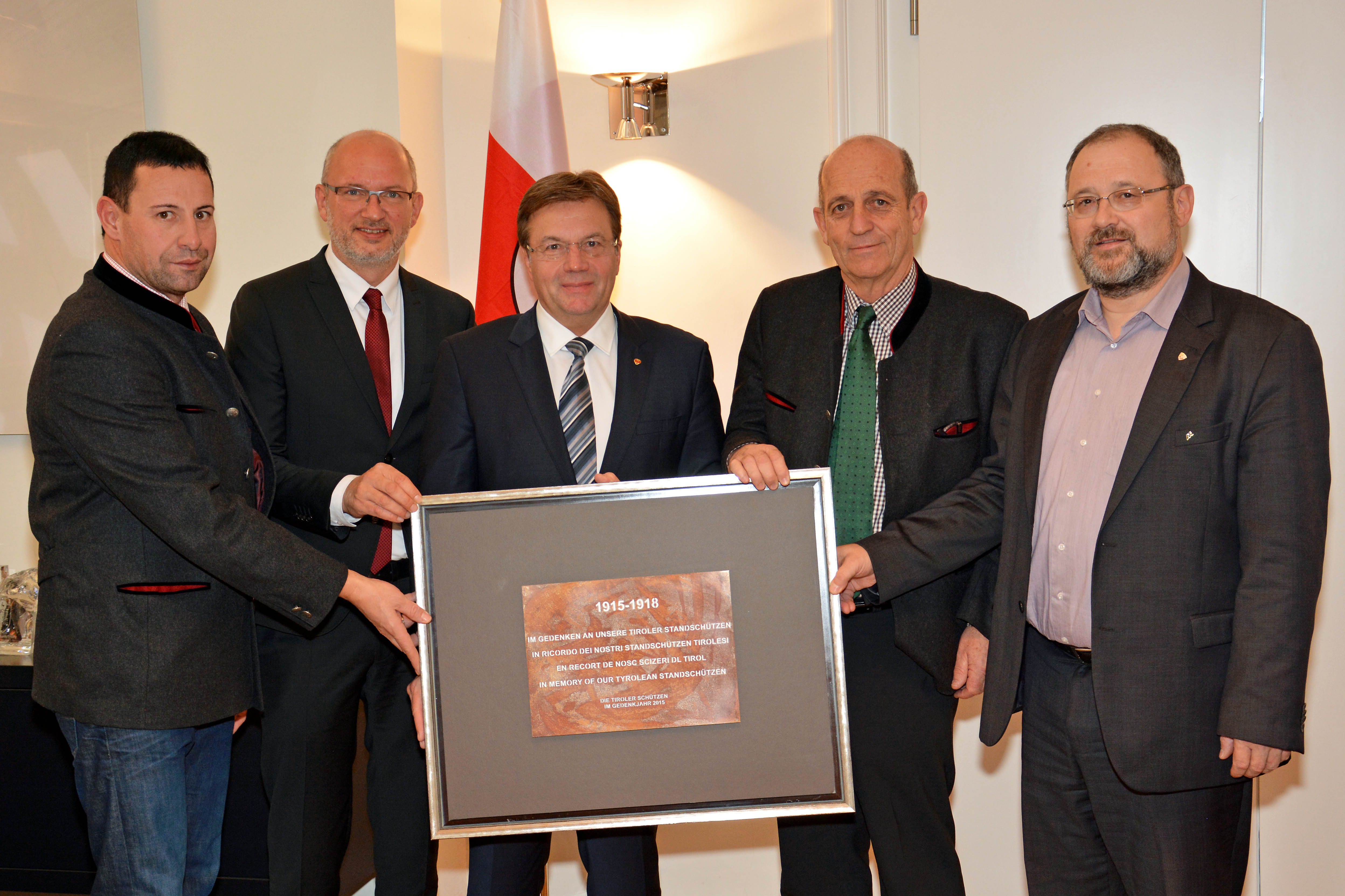 Sie überreichten dem Landeshauptmann eine Gedenktafel, die auch bei den über 75 Gedenkkreuzen, die in Tirol, Südtirol und dem Trentino an der damaligen Südfront errichtet wurden, und an das letzte Ausrücken der Tiroler Standschützen vor 100 Jahren erinnere. Auch bei der Gedenkfeier im Mai richteten Vertreter der Schützenbünde aller drei Regionen ein Gedenkkreuz auf.