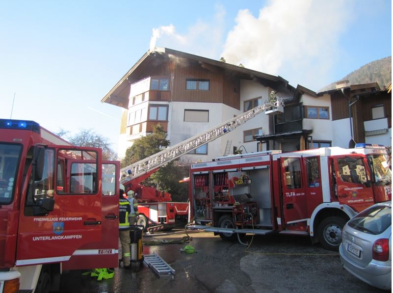 Durch den massiven Einsatz der Feuerwehren Unterlangkampfen, Niederbreitenbach, Oberlangkampfen, BtF Sandoz Schaftenau, Kufstein mit der Drehleiter und Wörgl mit dem Hubsteiger konnte ein Übergreifen des Brandes auf weitere Wohnungen und den gesamten Dachstuhl verhindert werden.