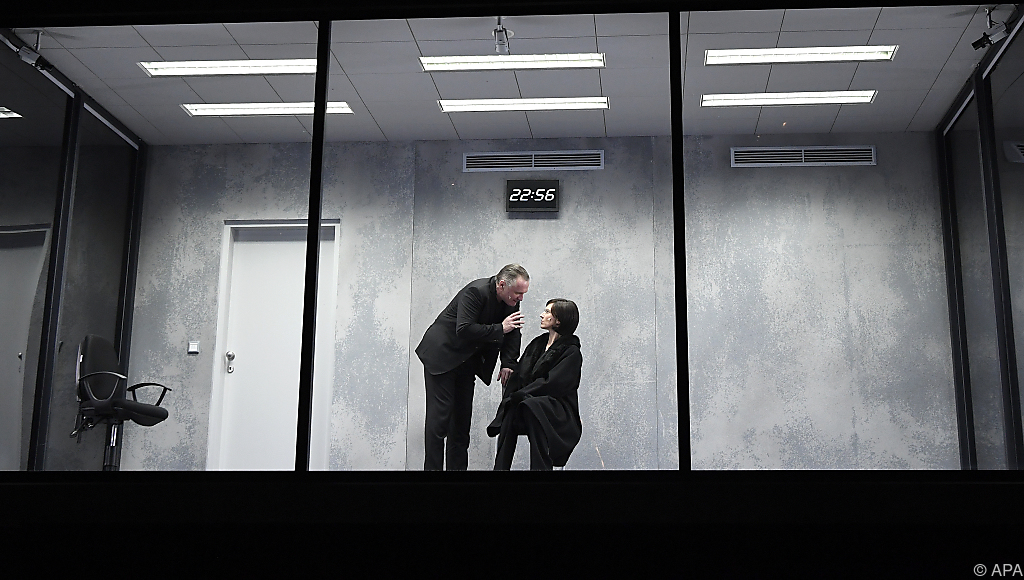 Als Ort hat Walter Vogelweider einen gläsernen Vernehmungsraum konstruiert, aus dem nur die durch Mikrofone verstärkten Stimmen der beiden Protagonisten dringen. Nur ein einziges Mal dreht sich die Bühne und dahinter wird eine Kommandozentrale sichtbar, in der die Bilder aus den Überwachungskameras im Raum übertragen werden. Es ist Herbert Föttinger hoch anzurechnen, dass er es bei diesem Sidekick belassen und ansonsten auf – auf der Hand liegende – Videoprojektionen verzichtet hat.