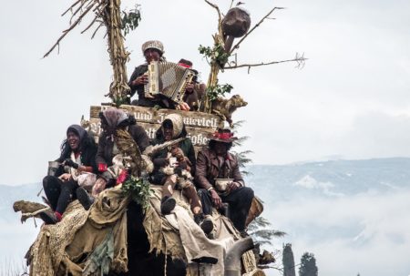 Hinter und vor der Hauptfigur versammelten sich Knechte, Wegmacher, die Bauernschaft, die Ratsherren – ebenfalls in elegantem Schwarz mit Zylinder. Die Ratsherren bedienten sich ganz wie die „Alten“, einer Reihe von feudalen Requisiten, wie dem Protokollbuch, dem Regenschirm, zweier Leuchter und einer Leiter – dieser sonderbaren Zusammensetzung eilte der Protokollverkünder voraus. Und natürlich haben auch die jungen Traminer des Egetmannes Hansl Eheaufgebot lautstark verkündet, im glasklaren und unmissverständlichem Traminer Dialekt versteht sich.