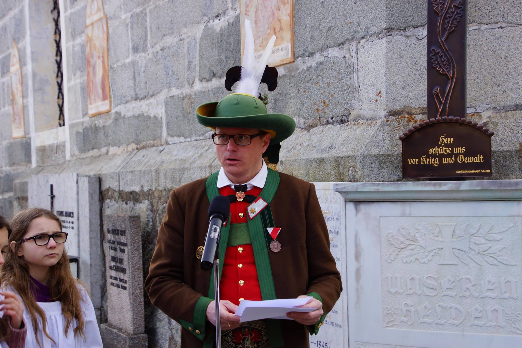 Höhepunkt der Gedenkfeier war dann auch die Gedenkrede von Major Günther Mairhofer. Er erinnerte an das Ende des 1. Weltkrieges vor 100 Jahren und zählte die 19 Vahrner Gefallenen namentlich auf. Stellvertretend für die Gefallenen zeichnete er das kurze Kriegsleben des Alois Kostner, gefallen in Serbien, sowie die dramatischen Ereignisse und Folgen für unser Land, nach.