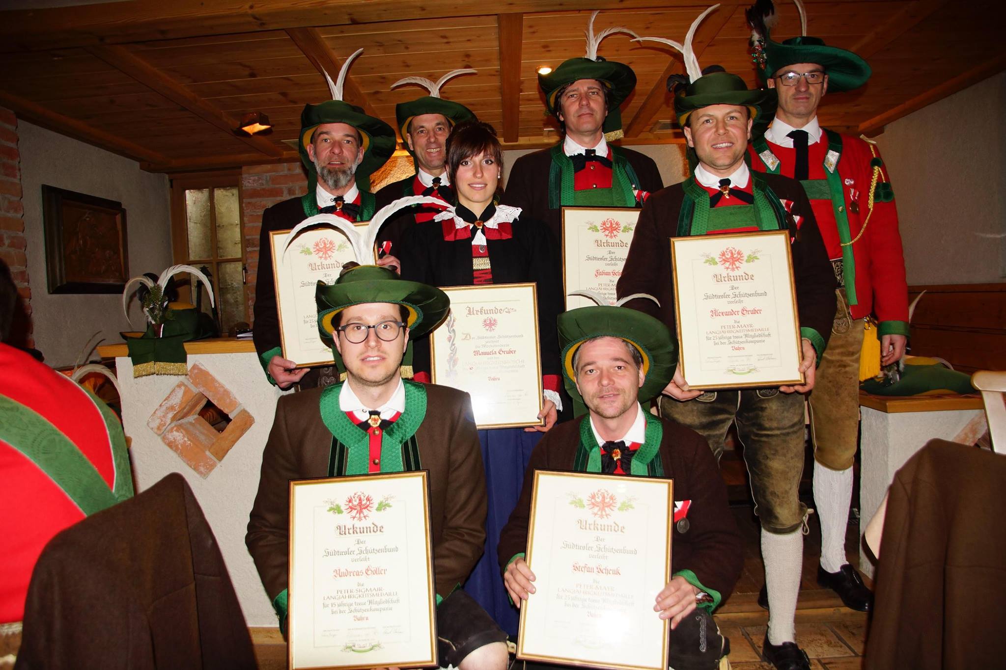 Anschließend wurden Ralf Salcher, Fabian Schenk, Stefan Schenk, Harald Günther und Alexander Gruber mit der Peter-Mayr-Medaille für 25 Jahre Treue ausgezeichnet. Für 15 Jahre Treue und somit mit der Peter-Sigmair-Medaille wurde Andreas Göller ausgezeichnet. Ebenfalls ausgezeichnet wurde Marketenderin Manuela Gruber. Für 10 Jahre Treue konnte sie ebenfalls aus den Händen von Hauptmann Werner Burger und Bezirksmajor Helmuth Oberhauser die Urkunde und die Katharina-Lanz-Medaille in Empfang nehmen.