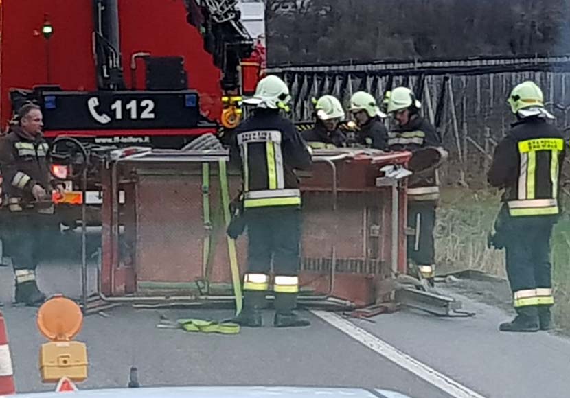 Für die Bergung der Hebebühne wurde die Freiwillige Feuerwehr Leifers zur Unterstützung herbeigerufen. Ebenfalls im Einsatz standen die Ordnungshüter und der Straßendienst.