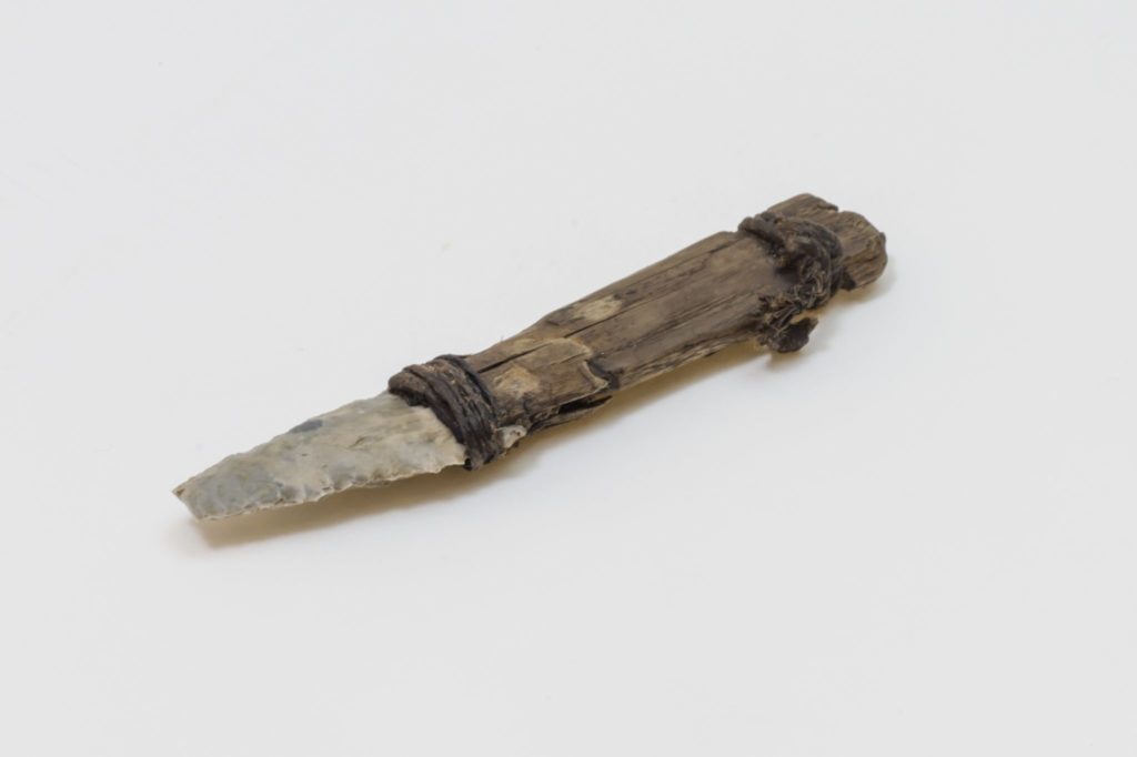 Der Mann aus dem Eis hatte auf seinem Weg auf das 3.210 m hoch gelegene Tisenjoch eine kompakte Feuersteinausrüstung dabei: Zu seinem Überlebens-Kit gehörten ein Dolch mit sehr kurzer Klinge und abgebrochener Spitze sowie zwei Pfeilspitzen. In der Gürteltasche fanden sich ein Kratzer und ein Bohrer, beide stark abgearbeitet, sowie ein kleiner Feuersteinabschlag und, nicht zu vergessen, der weltweit einzigartige Retoucheur zum Feuersteinbearbeiten. Zum Vergleich wurden CT-Aufnahmen der tödlichen Pfeilspitze herangezogen, die weiterhin in situ in der Schulter von Ötzi steckt.