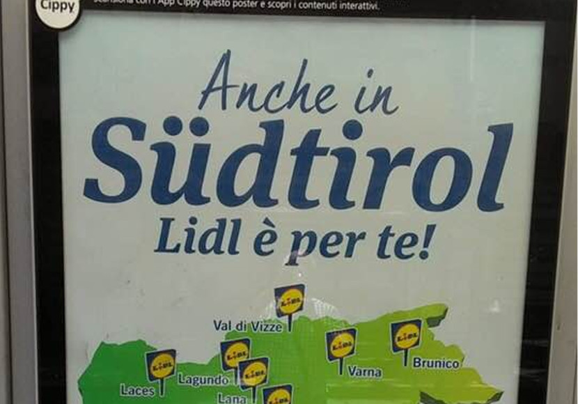 Lidl wirbt an diversen Bushaltestellen im Land mit dem Spruch „Anche in Südtirol Lidl è per te!“. Der Slogan und die Ortsbezeichnungen sind in italienisch gehalten, der Rest des Plakates in beide Landessprachen übersetzt.