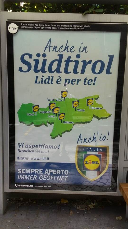 Lidl wirbt an diversen Bushaltestellen im Land mit dem Spruch „Anche in Südtirol Lidl è per te!“. Der Slogan und die Ortsbezeichnungen sind in italienisch gehalten, der Rest des Plakates in beide Landessprachen übersetzt.