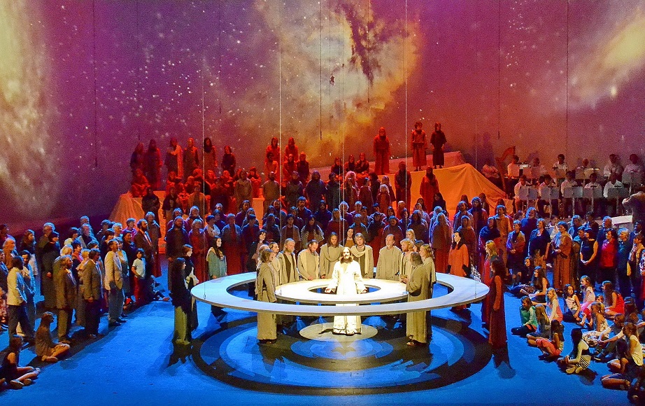 1.500 Besucher können pro Vorstellung in den ansteigenden Sitzreihen der Aufführung folgen (in deutscher Sprache mit englischen Übertiteln).