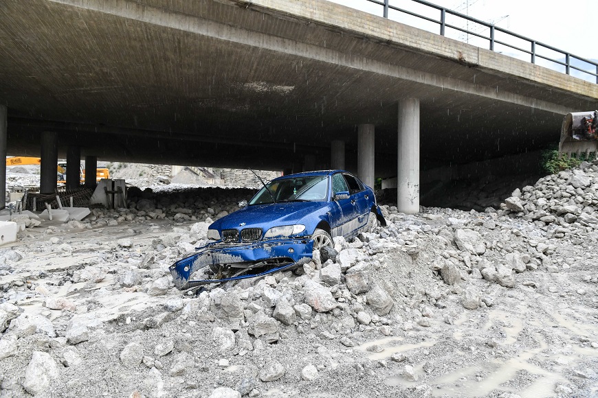 Ein dort befindlicher PKW mit drei einheimischen Insassen (20,18 und 17) ist von den Geröllmassen erfasst worden.