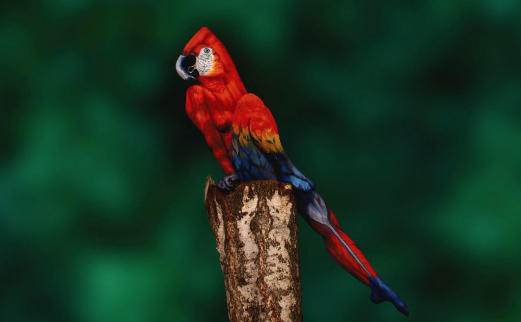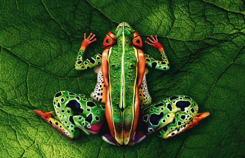 Seine bekannteste Werke sind optische Täuschungen. Er bringt Models auf einem vorbereiteten Hintergrund in eine bestimmte Position, damit sie die Form eines Tieres bilden und bemalt anschließend ihren Körper. Das Ergebnis sieht täuschend echt aus.