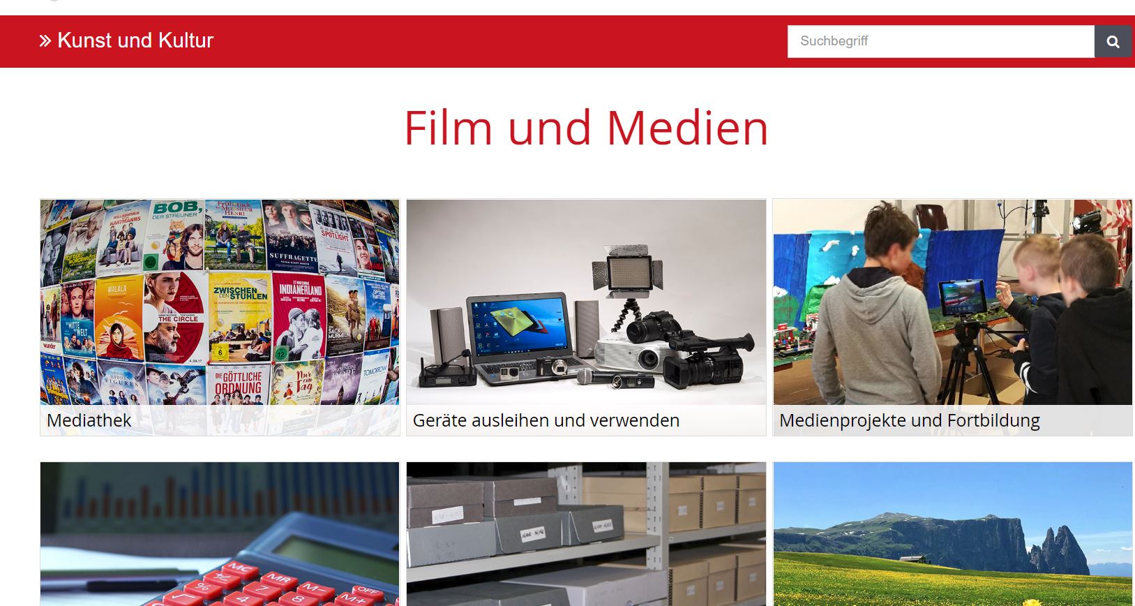 www.provinz.bz.it/kunst-kultur/film-medien/ ist die Adresse des neuen Webauftrittes im Bereich Film und Medien. In übersichtlicher Weise werden hier alle Angebote und Projekte des Landes Südtirol präsentiert: vom Medien- und Geräteverleih bis hin zu speziellen Medienprojekten, Fortbildungsangeboten und Fördermöglichkeiten. Im Medienshop des deutschen Amtes für Film und Medien finden Interessierte ein breitgefächertes Angebot an Dokumentarfilmen zum Thema Südtirol. Darüber hinaus sind im Medienarchiv rund 300.000 Fotografien, 5000 Filme und 2000 Tonaufnahmen online zugänglich. Über die neue Webseite ist es auch möglich, in Bücherkatalogen zu stöbern.