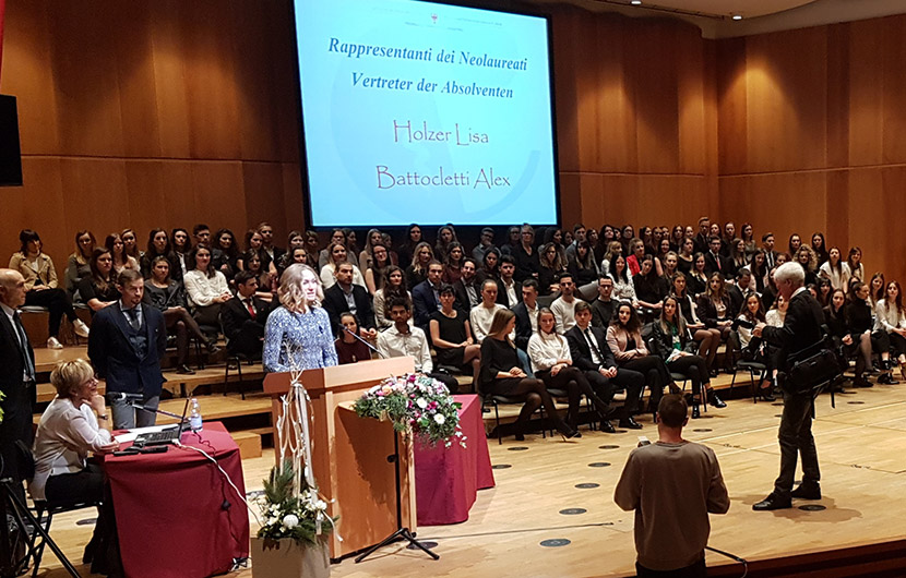 „Alle Jenen, die heute ihr Diplom in den Händen halten, möchte ich von Herzen gratulieren! Ihr habt einen – für die Gesellschaft – sehr wertvollen Beruf gewählt. Alles alles Gute, viel Freude und Erfüllung damit!“ so Guido Bocchio bei der Eröffnungsrede. Im Rahmen der Feier wurde auch Landesrätin Martha Stocker verabschiedet. Klaus Eisendle, der Präsident der Claudiana, bedankte sich bei der scheidenden Landesrätin für Sanität, Soziales, Arbeit und Sport für die gute Zusammenarbeit in all diesen Jahren und für die große Unterstützung. Insgesamt studieren zurzeit an die 650 StudentInnen an der Fachhochschule. Nicht jedes Jahr werden an der Claudiana alle 12 Studiengänge angeboten, d.h. nicht in jedem Jahr sind Abgänger aller Studiengänge vorhanden. Die Studienplätze werden aufgrund einer Bedarfserhebung ausgeschrieben.