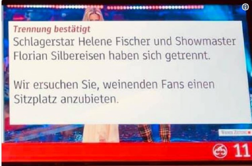 Die plötzliche Trennung von Helene Fischer und Florian Silbereisen sorgt für durchdringende Anteilnahme. Der Verkehrs- und Bahn-Betrieb in Wien verbreitete die Nachricht über die Trennung auf den Info-Bildschirmen in seinen U-Bahnen und schrieb dahinter: „Wir ersuchen Sie, weinenden Fans einen Sitzplatz anzubieten.“