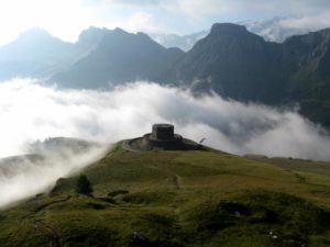 Il cimitero militare germanico del Pordoi sorge a 2239 m di quota, fra le dalle cime dolomitiche di Fassa e Badia. Eretto dal Volksbund Deutsche Kriegsgräberfürsorge a seguito dell’accordo fra il Reich ed il Regno d’Italia del 1937, fu inaugurato ufficialmente nel 1959.   Nella cripta, realizzata già nel 1939, riposano le salme di 8582 caduti della Prima Guerra Mondiale, per la gran parte appartenenti alle nostre truppe ed esumate dai diversi cimiteri di guerra sparsi lungo tutto il fronte tirolese; inoltre 849 caduti germanici della Seconda Guerra sono sepolti in semplici tombe all’interno del primo cerchio murario.