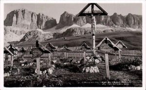 Il cimitero militare germanico del Pordoi sorge a 2239 m di quota, fra le dalle cime dolomitiche di Fassa e Badia. Eretto dal Volksbund Deutsche Kriegsgräberfürsorge a seguito dell’accordo fra il Reich ed il Regno d’Italia del 1937, fu inaugurato ufficialmente nel 1959.   Nella cripta, realizzata già nel 1939, riposano le salme di 8582 caduti della Prima Guerra Mondiale, per la gran parte appartenenti alle nostre truppe ed esumate dai diversi cimiteri di guerra sparsi lungo tutto il fronte tirolese; inoltre 849 caduti germanici della Seconda Guerra sono sepolti in semplici tombe all’interno del primo cerchio murario.