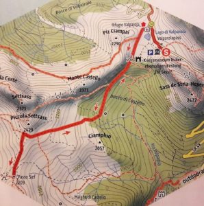 Percorso: Lasciata l’auto al parcheggio nei pressi del Rifugio Valparola (a quota 2178) , si segue il sentiero marcato con il numero 23 (che ha un secondo accesso alle Edelweissstellungen), in direzione del Monte Sief. Appena sotto il Sief, all’attacco dell’ascesa che dalla Sella Sief (a quota 2209 metri) porta verso il Settsass, si trova la croce di An der Front.