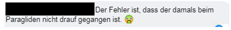 „Der Fehler ist, dass der damals beim Paragliden nicht drauf gegangen ist“, schreibt der Facebook-Fan des Grünen-Politikers und spielt dabei auf den tragischen Unfall Hofers vor einigen Jahren an. Mittlerweile wurde der Kommentar entfernt.