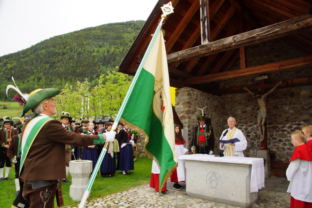 Es folgte die feierliche Segnung durch den Herrn Pfarrer und der traditionelle Fahnenkuss mit der alten Kompaniefahne aus dem Jahre 1959 und der Bezirksfahne. Musikalisch umrahmt wurde der gesamte Festakt von der Musikkapelle Vahrn.
