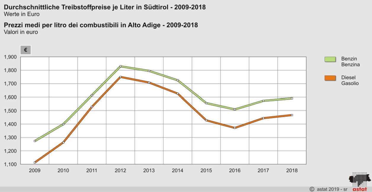 Es ist bekannt, dass in Italien die Treibstoffpreise wegen der hohen Verbrauchssteuern am höchsten sind. Während die Benzinpreise in Südtirol im Jahr 2018 nur um 4 Cent pro Liter höher sind als jene in Trient (Diesel um 3 Cent), ist Benzin in Innsbruck im Durchschnitt um etwa 32 Cent pro Liter billiger (Diesel um 30 Cent).