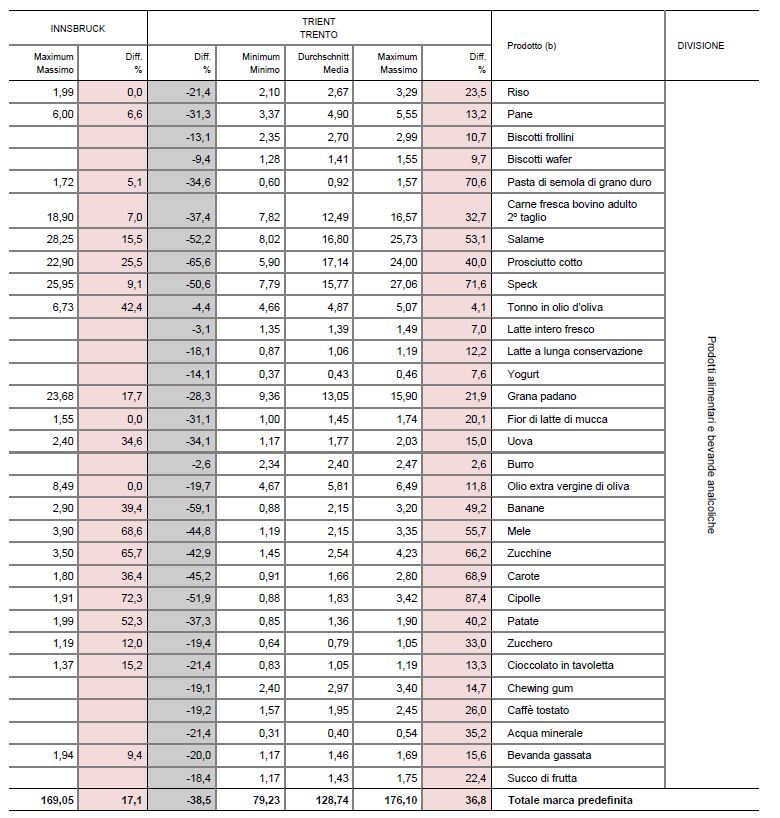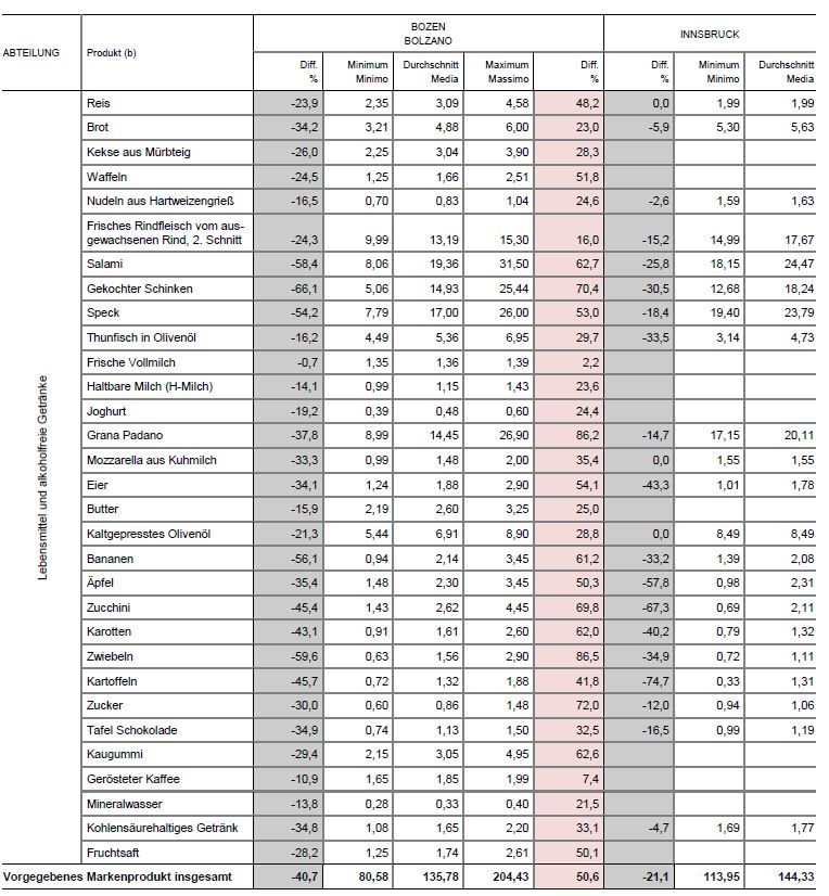 Ein Vergleich einzelner Markenprodukte im Bereich Lebensmittel zeigt von Trient über Bozen nach Innsbruck einen stetigen Anstieg der Durchschnittspreise für einige typisch mediterrane Produkte, wie etwa Grana Padano, Mozzarella und Olivenöl. Am höchsten sind die Preise in Innsbruck außerdem für Fleisch und Wurstwaren sowie für die meisten Obst- und Gemüsesorten. In sämtlichen Preiskategorien sind teilweise deutliche Unterschiede festzustellen.