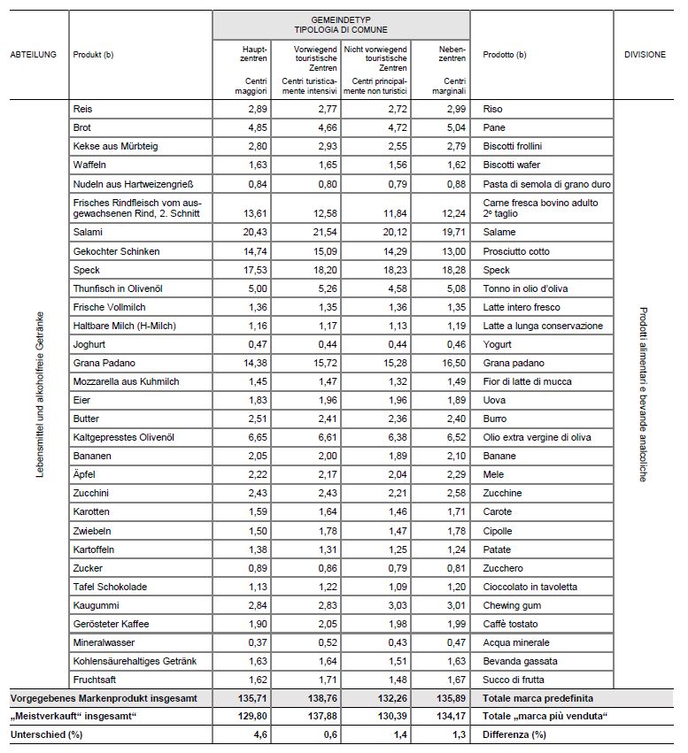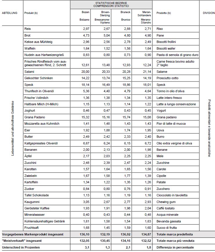 Auch nach dem Kriterium des meistverkauften Produktes weisen insbesondere die typisch mediterranen Produkte markante Unterschiede auf. Für 1 kg Grana Padano bezahlt man in Trient durchschnittlich 13,05 Euro, während in Bozen 14,45 Euro und in Innsbruck 20,11 Euro aufzuwenden sind. Eine Packung Nudeln zu 500 g kostet in Trient durchschnittlich 0,58 Euro, in Bozen 0,63 Euro und in Innsbruck 1,26 Euro. Für einen Liter Olivenöl gibt man in Trient 5,27 Euro, in Bozen 5,65 Euro und in Innsbruck 6,98 Euro aus. Eine
