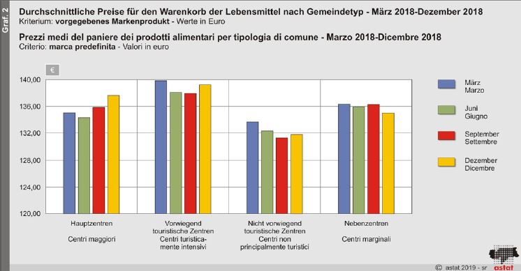 Die Milchprodukte sowie die erhobenen Süßigkeiten sind in Bozen teurer als in Trient und Innsbruck. Für Mineralwasser und kohlensäurehaltige Getränke bezahlt man in Bozen mehr als in Trient, aber weniger als in Innsbruck. Im Gegensatz dazu wurde für die Getränke an der Bar (Wein, Bier, alkoholfreie Getränke) in Bozen jeweils der niedrigste Durchschnittspreis ermittelt. Auch das Essen in Restaurants oder Pizzerie ist in Trient deutlich teurer als in Bozen.