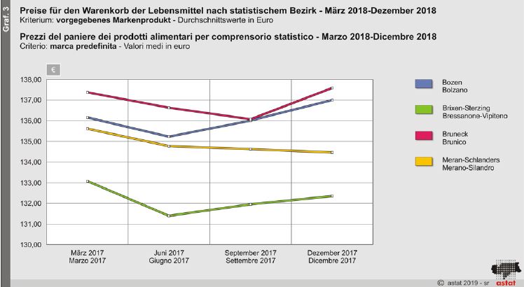 Der statistische Bezirk Brixen-Sterzing hat den günstigsten Warenkorb (132,19 Euro), es folgen Meran- Schlanders (134,87 Euro), Bozen (136,10 Euro) und zuletzt Bruneck mit dem teuersten Warenkorb (136,92 Euro). Betrachtet man die vier Erhebungen, die im Laufe des Jahres durchgeführt wurden, so ist der Warenkorb in den statistischen Bezirken Brixen-Sterzing und Bozen im Juni am günstigsten, in Bruneck im