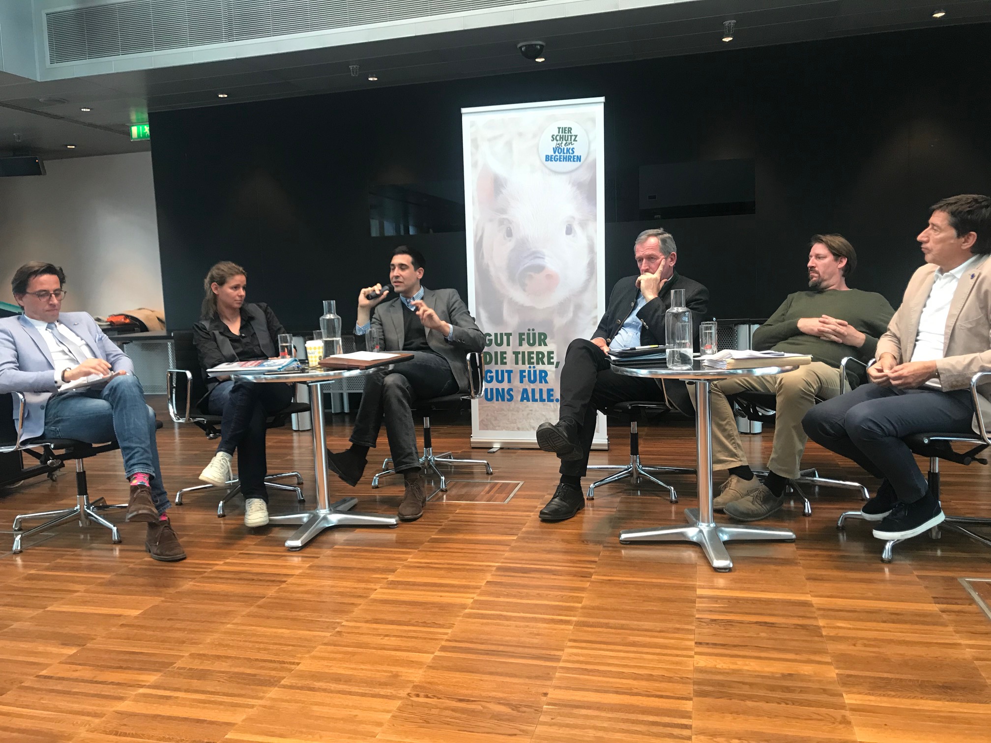 Laut einer repräsentativen Bertelsmann-Studie „Europa hat die Wahl“ wünschen sich 68% der Befrag-ten in Österreich eine Verschärfung der EU-Auflagen bei Massentierhaltung. Das Tierschutzvolksbe-gehren lud daher am Freitag zur Podiumsdiskussion, welcher VertreterInnen aller im EU-Parlament präsenten Parteien folgten und konfrontierte sie nach ihren Positionen und Plänen zur Verbesserung des Tierwohls. Am Podium diskutierten Christina Bielowski (SPÖ), LAbg. Hermann Kuenz (ÖVP), LAbg. Alexander Gamper (FPÖ), MEP Thomas Waitz (Die Grünen) und Dr. Johannes Margreiter (Neos).
