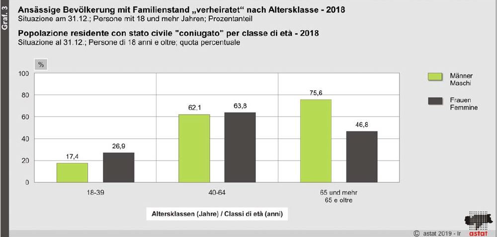 In Südtirol leben fast 50% der volljährigen Personen in einer Ehe. Je nach Alter ergeben sich auch Abweichungen zwischen Männern und Frauen. In der Altersgruppe zwischen 18 und 39 Jahren sind Frauen häufiger verheiratet als Männer: 26,9% gegenüber 17,4%. In der Altersgruppe von 40 bis 64 Jahren leben 62,1% der Männer und 63,8% der Frauen mit ihrem jeweiligen Ehepartner zusammen. Hier gibt es kaum einen Unterschied. Anders ist das bei Personen im höheren Alter. Ab dem 65. Lebensjahr leben 75,6% der Männer in einer Ehe, auf Frauen trifft dies nur mehr auf 46,8% zu. Hauptgrund dafür ist die höhere Lebenserwartung der Frauen mit einem entsprechend größeren Verwitwungsrisiko.