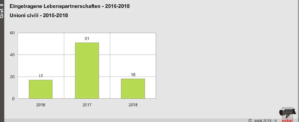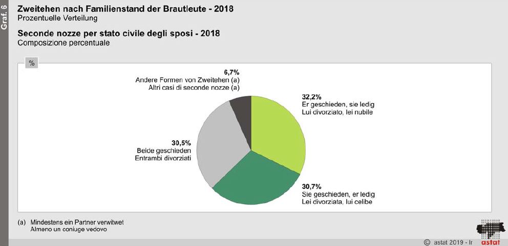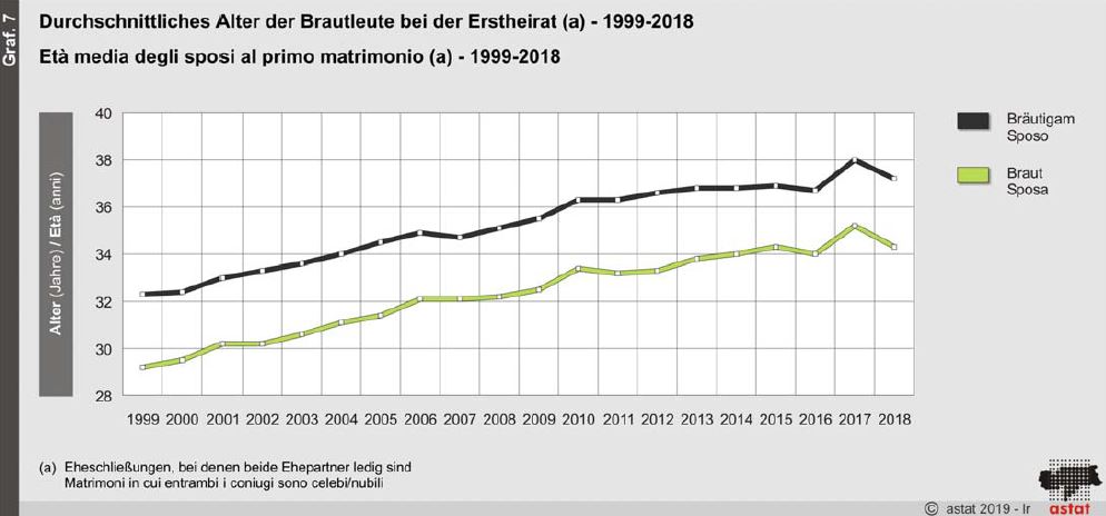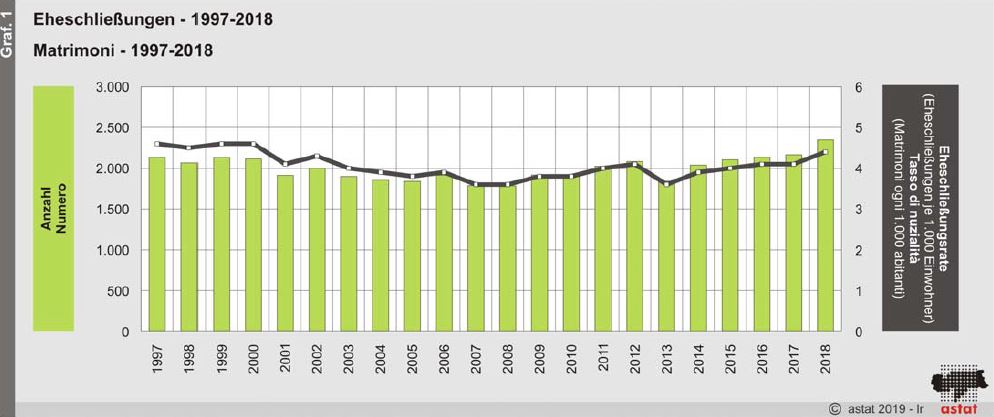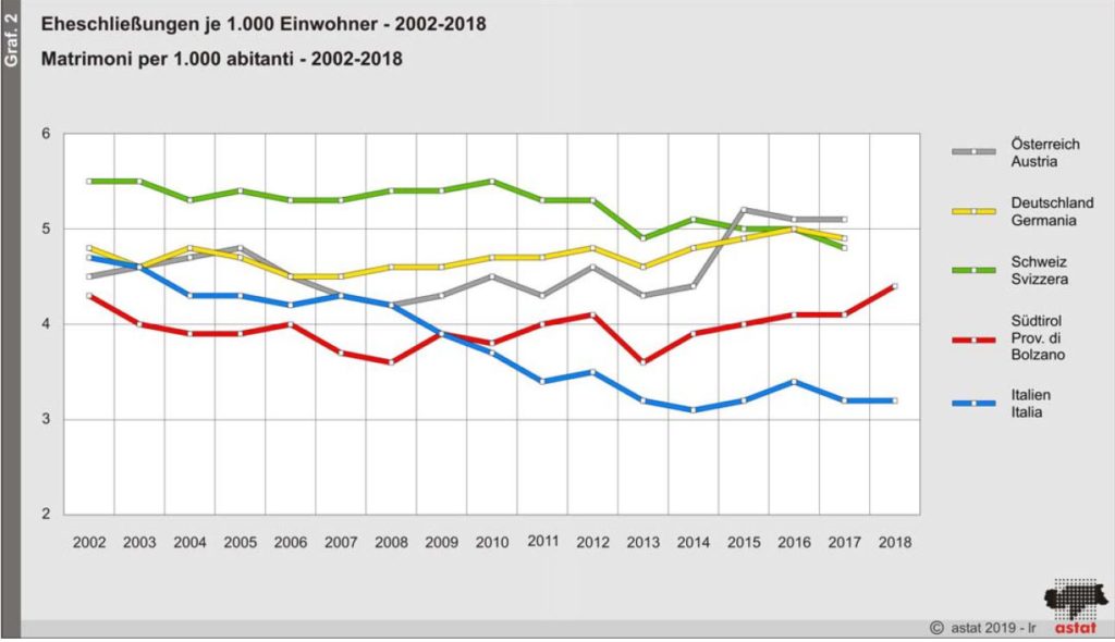 Seit dem Jahr 2002 ist die gesamtstaatliche Eheschließungsrate von 4,7‰ auf 3,2‰ im Jahr 2018 gesunken. Obwohl Südtiroler Paare wieder vermehrt heiraten, liegt die Rate noch deutlich hinter den Nachbarländern Deutschland, Österreich und der Schweiz (Quelle: ISTAT, ASTAT (2018), DEStatis, Statistik Austria und BFS (2017).
